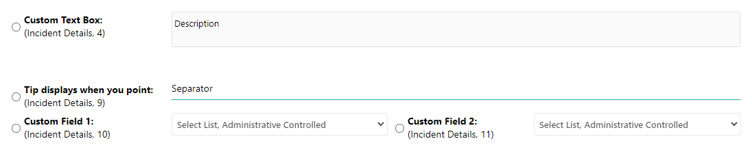 • Incident Fields appear in the Incident page. You can specify the sections where the fields will appear.
