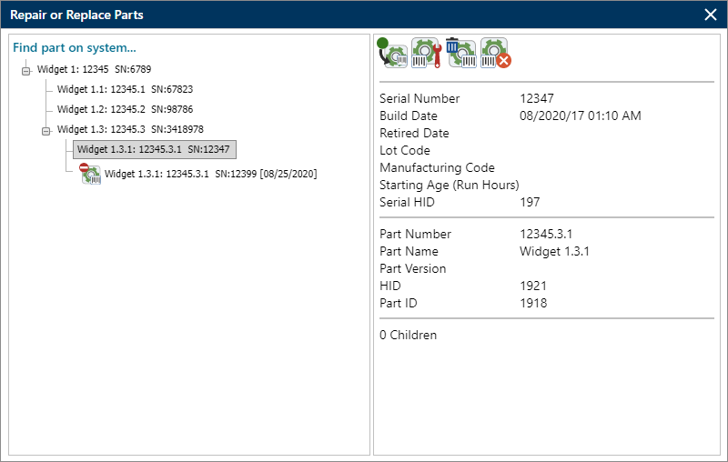 - If the Part Number is for a system template (i.e., a top-level part), the left panel shows this template. In this case, you can only repair / replace parts from that template.